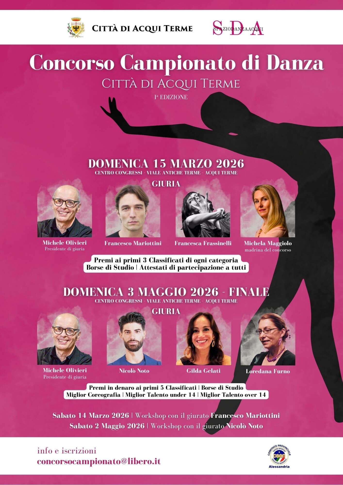 Acqui Terme City Dance Championship Competition - 1st Edition. A day dedicated to talent, passion, and the art of movement, with prizes, scholarships, and certificates for all participants. Judging Panel March 15: Michele Olivieri - Jury President Francesco Mariottini Michela Maggiolo - Competition Host. Prizes for the top three in each category. - Scholarships - Certificates of Participation Sunday, May 3 - Congress Center, Viale Antiche Terme. Dance Championship Competition Finals The grand finale with an exceptional jury: Final Jury: Michele Olivieri – Jury President Nicolò Noto Gilda Gelati Loredana Furno Monetary prizes for top-place winners Scholarships Best Choreography Best Talent Under 14 Best Talent Over 14 Workshop Saturday, March 14 with Francesco Mariottini Saturday, May 2 with Nicolò Noto. Info and registration: concorsocamionato@libero.it An unmissable event for schools, dancers, and enthusiasts. Acqui Terme is preparing to become a stage for talent, energy, and entertainment!