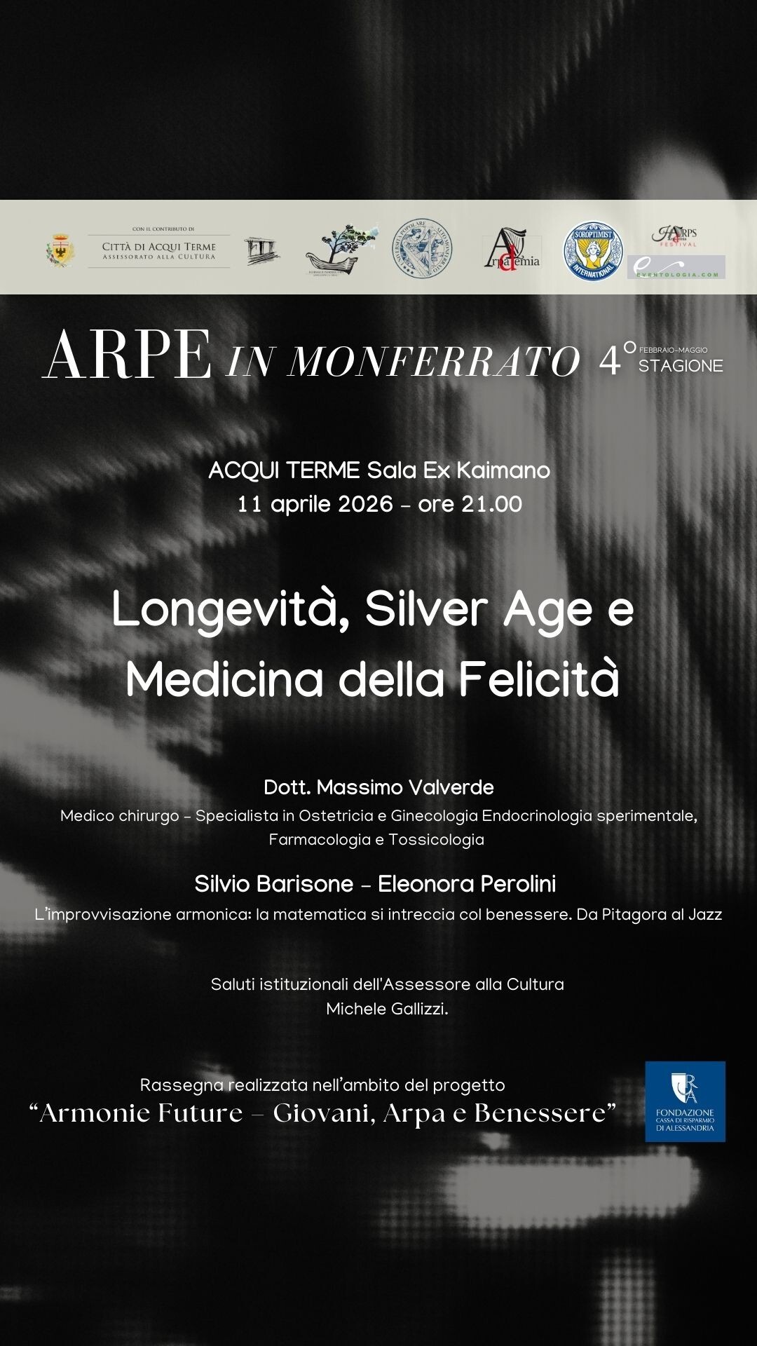 HARPS in MONFERRATO Season 4 Longevity, the Silver Age, and the Medicine of Happiness - Dr. Massimo Valverde, MD, specialist in obstetrics and gynecology, experimental endocrinology, pharmacology, and toxicology. Silvio Barisone and Eleonora Perolini - Harmonic improvisation: mathematics intertwines with well-being, from Pythagoras to Jazz. Artistic direction: Eleonora Perolini