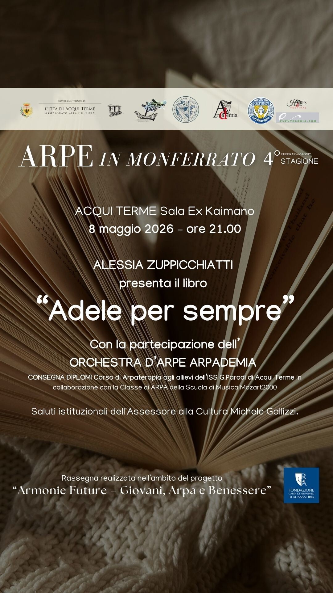 HARPS IN MONFERRATO SEASON 4 ALESSIA ZUPPICCHIATTI presents the book "Adele per sempre" - with the participation of the Arpademia Harp Orchestra. Harp Therapy Course diplomas awarded to students at the G. Parodi Institute of Acqui Terme, in collaboration with the harp class of the Mozart 2000 School of Music. Artistic direction: Eleonora Perolini.
